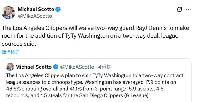 北京时间12月28日,据名记Scotto报道,快船将与泰泰-华盛顿签下一份双向合同,为了给他腾出位置,他们裁掉了雷吉-丹尼斯。华盛顿效力于发展联盟的圣迭戈快船队,场均得到17.9分,投篮命中率46.5%,三分命中率41.1%,此外还能贡献5.9次助攻、4.6个篮板和1.5次抢断。