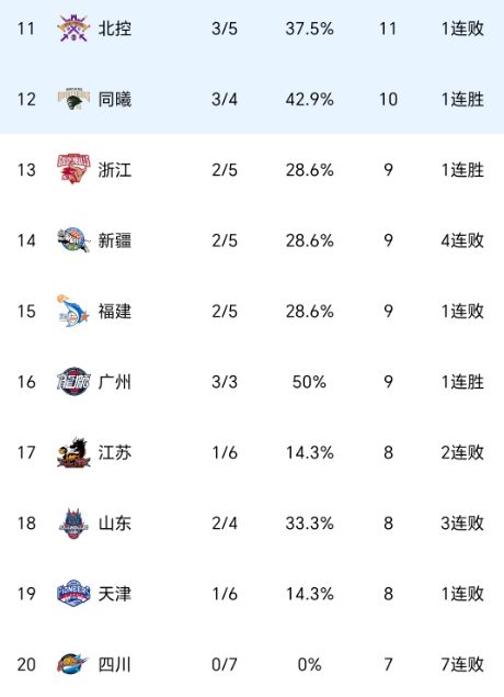 随着辽宁遭3连败,上海大胜北控,CBA最新积分榜:3大黑马杀进前6