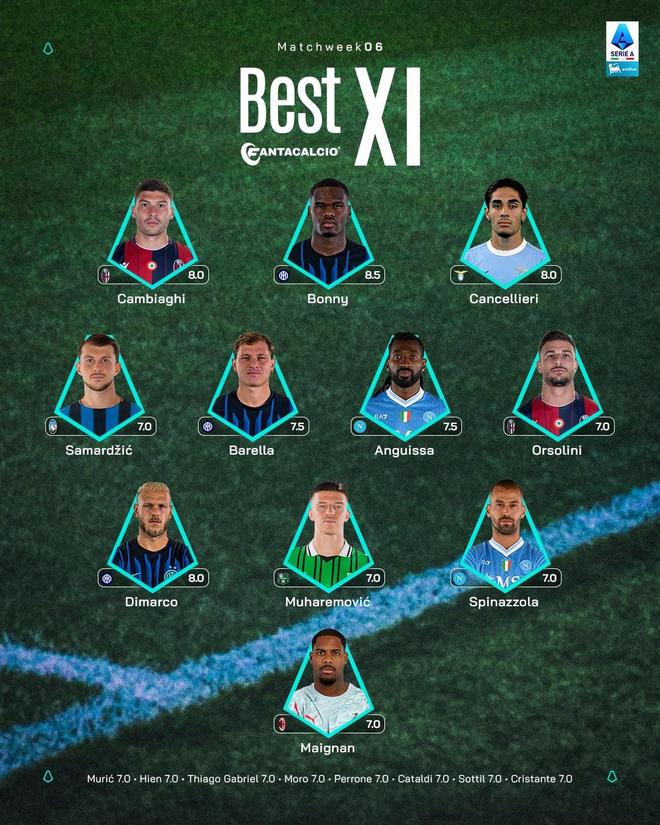 意甲第6轮最佳阵容:博尼领衔,国米3人入选,迈尼昂在列
